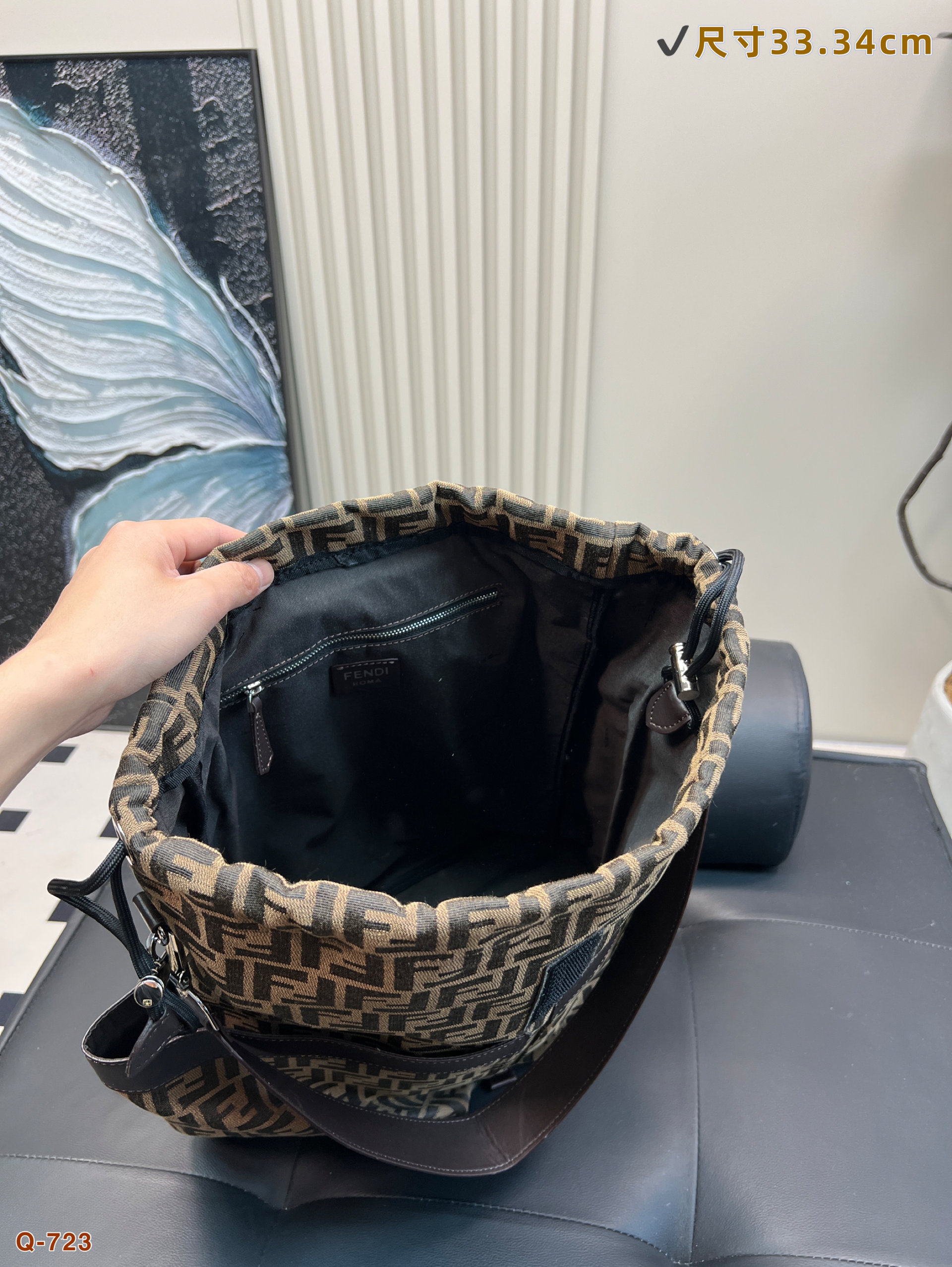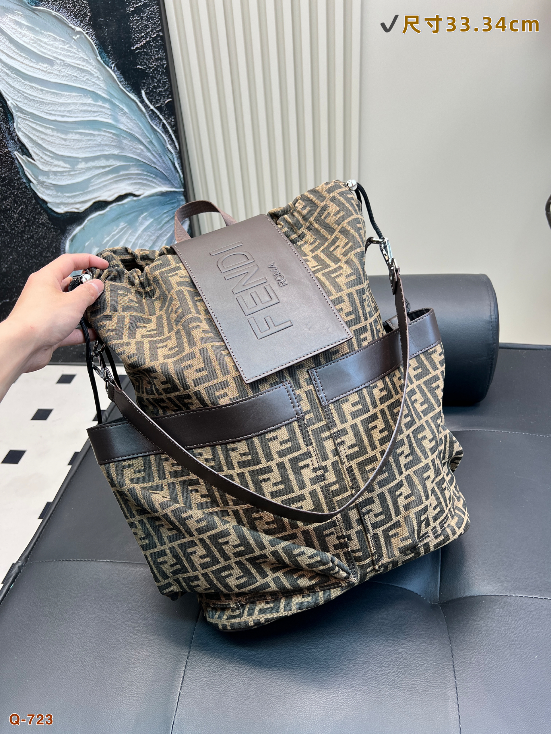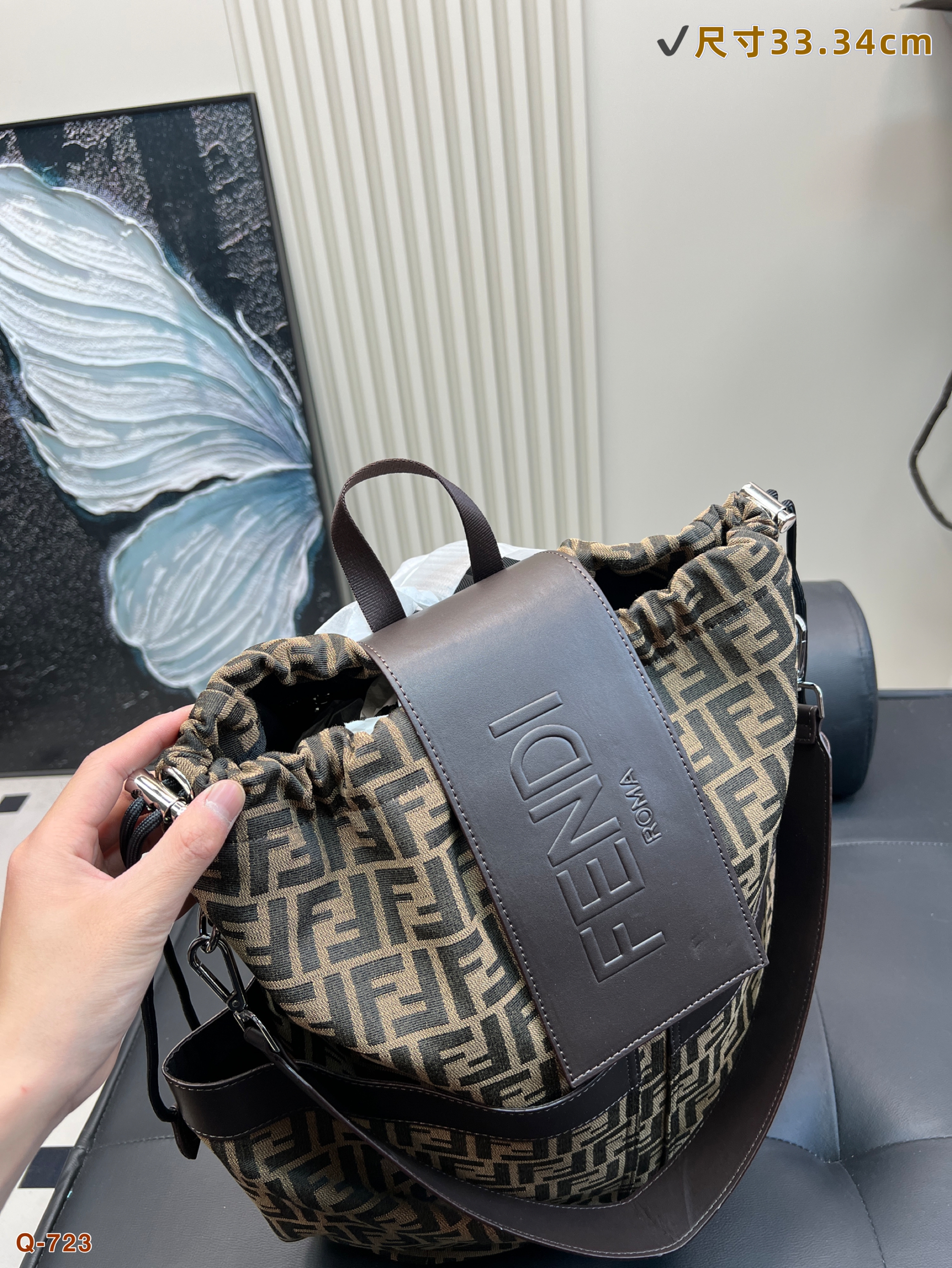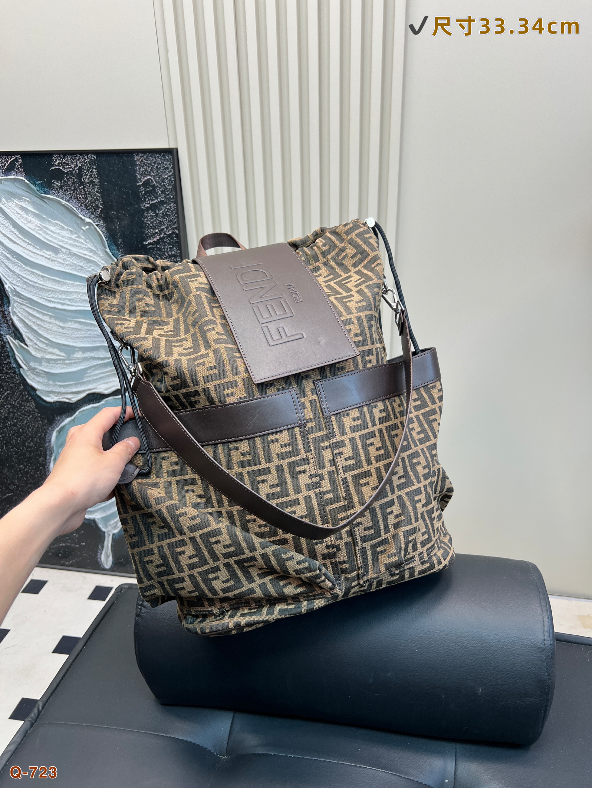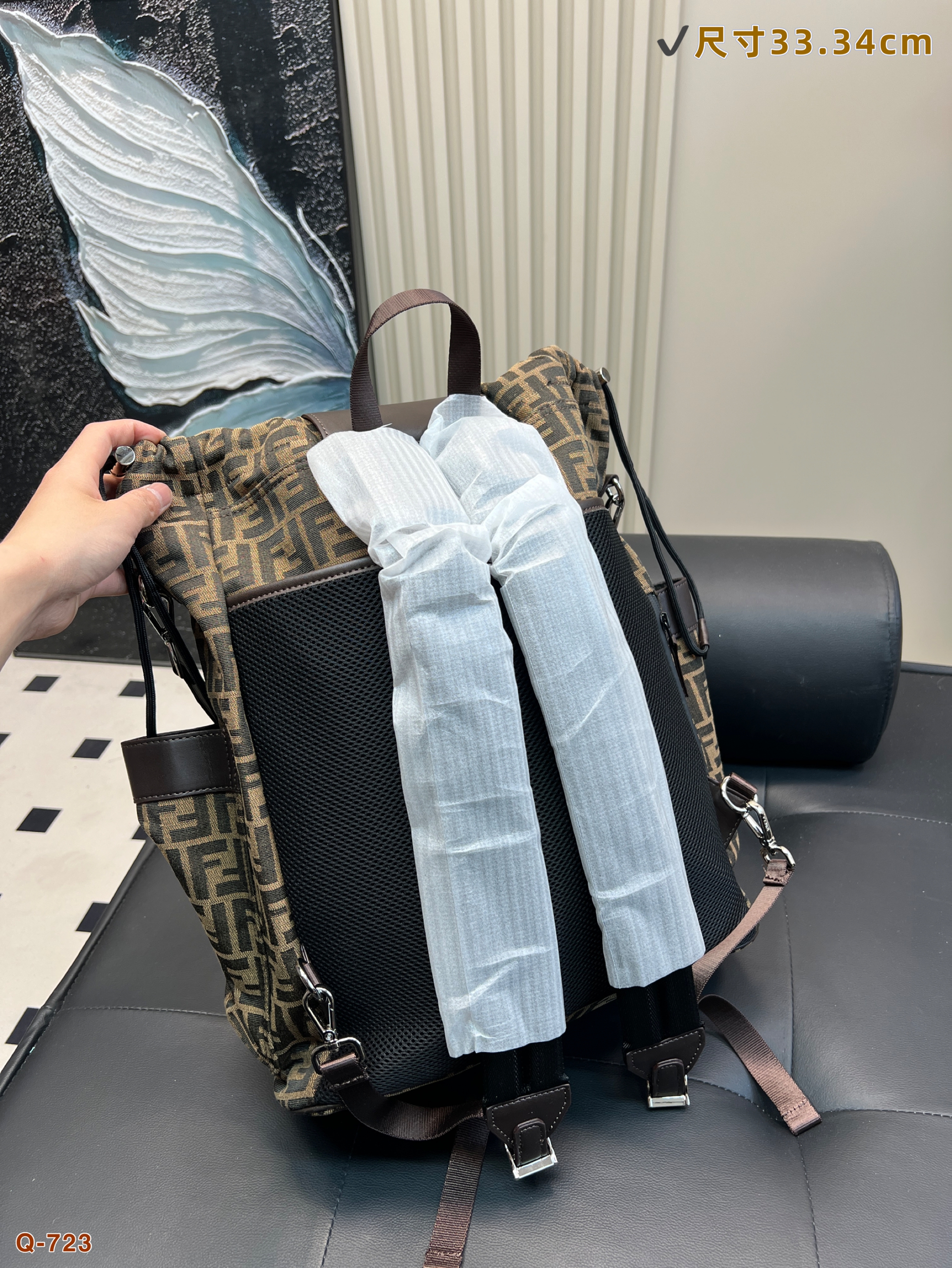 Size 34.44cmFendi fendi drawstring backpackTrendy men must have a strong auraSuper fashion sense, high sense of knowledgeVery suitable for carrying belongings~The fabric is wear-resistant and scratch-resistant, suitable for boys' careless personality